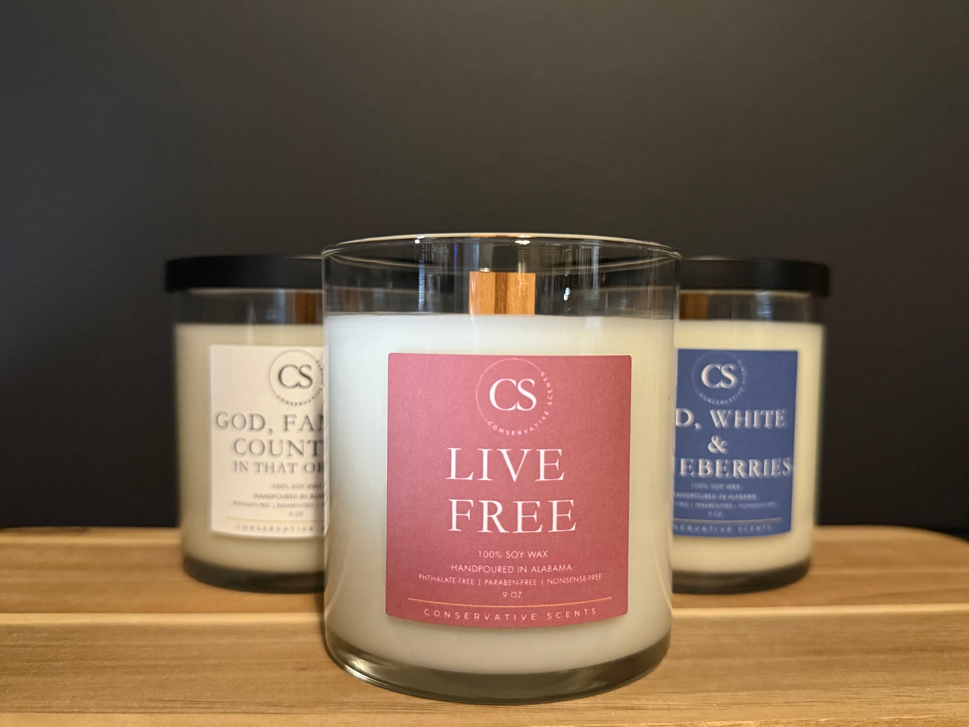 Our 9 oz coconut-soy candle pairs clean-burning wax with a natural wood wick for a longer, even burn and an effortless scent throw. Hand-poured in small batches and made with phthalate-free fragrance oils, this candle is a tribute to the American spirit — strong, free, and unstoppable.